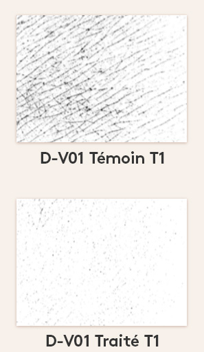Les photos ci-dessous présentent les résultats moyens obtenus. Sur l’image « témoin », La crème n’a pas été appliquée sur la peau. Sur l’image « traité », la Crème de l’Apicultrice® anti-âge a été appliquée. Les 2 zones ont ensuite été exposées aux microparticules de carbone, puis rincées à l’eau, essuyées et séchées à l’air libre. Les photos ont été prises après le séchage. Les photos ont ensuite été analysées par un logiciel pour quantifier le nombre de pixels sombres proportionnel à la quantité de microparticules présentes sur la peau.