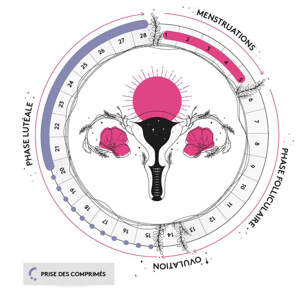 Morning and night, well before or after meals, swallow 2 tablets with a glass of water. Begin on the 14th day of your cycle until your period starts (roughly 2 weeks beforehand). Renew for the next menstruel cycle.