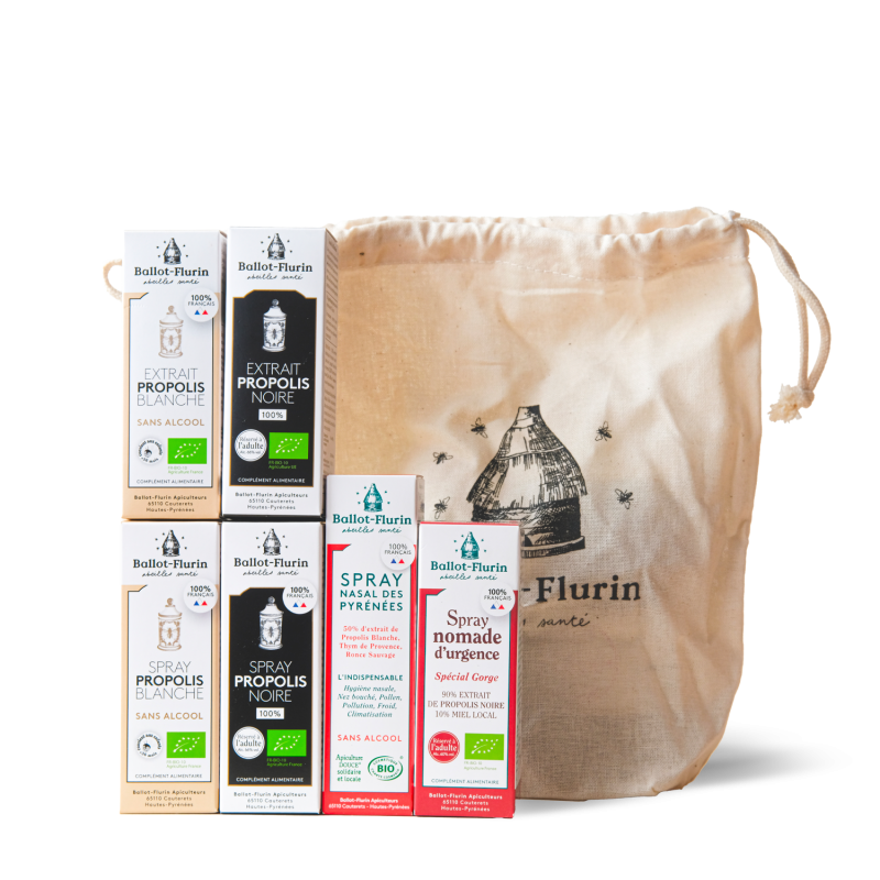 Nous avons réuni plusieurs préparations d’apithérapie dans ce pochon cadeau pour faire profiter vos proches de toute la force protectrice de la propolis, alliée à la douceur des Pyrénées.